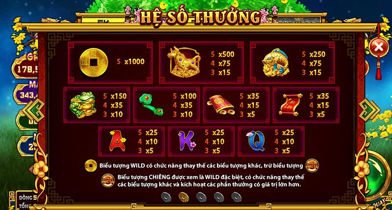 Những tổ hợp nào đáp ứng tiêu chí mà trò chơi quy định thì sẽ được nhận thưởng hệ số như công bố. Trường hợp có nhiều tổ hợp xuất hiện thì hệ thống chỉ tính kết quả nào có mức hệ số lớn nhất trên 1 dòng thưởng.
